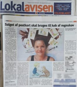 Ane Gudrun fik en god idé, tegnede seks illustrationer til Randers Regnskovs Naturfond. Illustrationer er tryk gratis af Lasertryk på små fine kort, som nu bliver solgt til fordel for opkøb af regnskov i Ecuador.