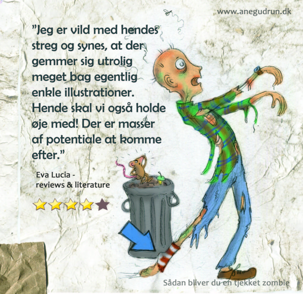 “Man læser og mores undervejs, samtidig med at man bliver nødt til at stoppe op og nærstudere illustrationerne. Selvom de er klamme (for det er jo zombier), så fanger Ane Gudrun simpelthen essensen af det. Jeg er vild med hendes streg og synes, at der gemmer sig utrolig meget bag egentlig enkle illustrationer. Hende skal vi også holde øje med! Der er masser af potentiale at komme efter.” Eva Lucia