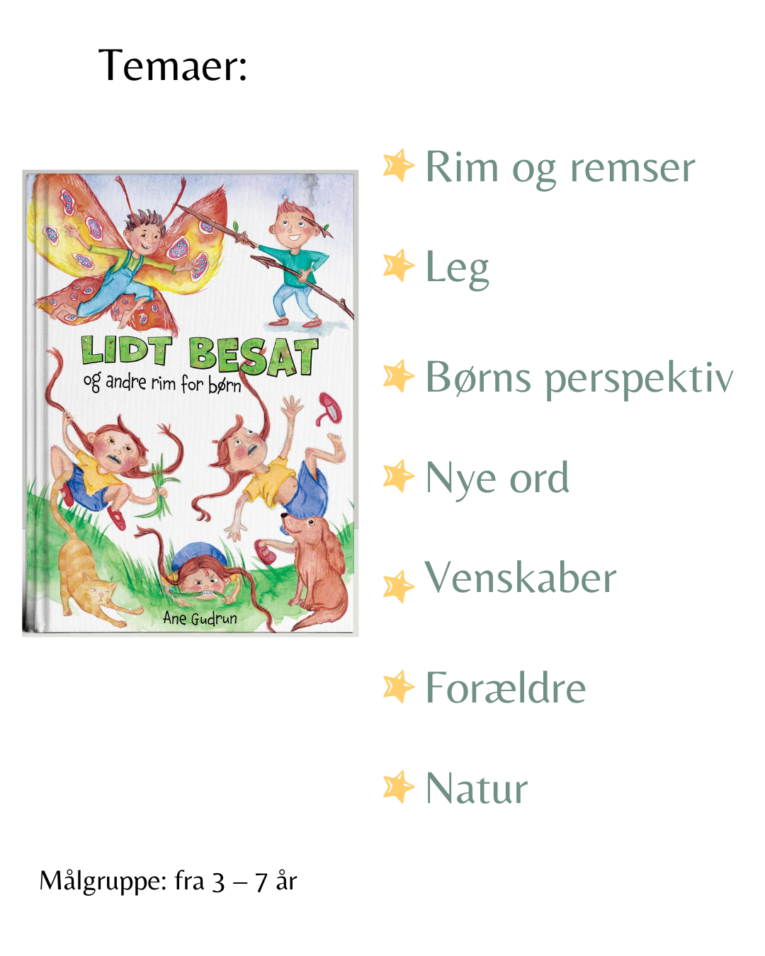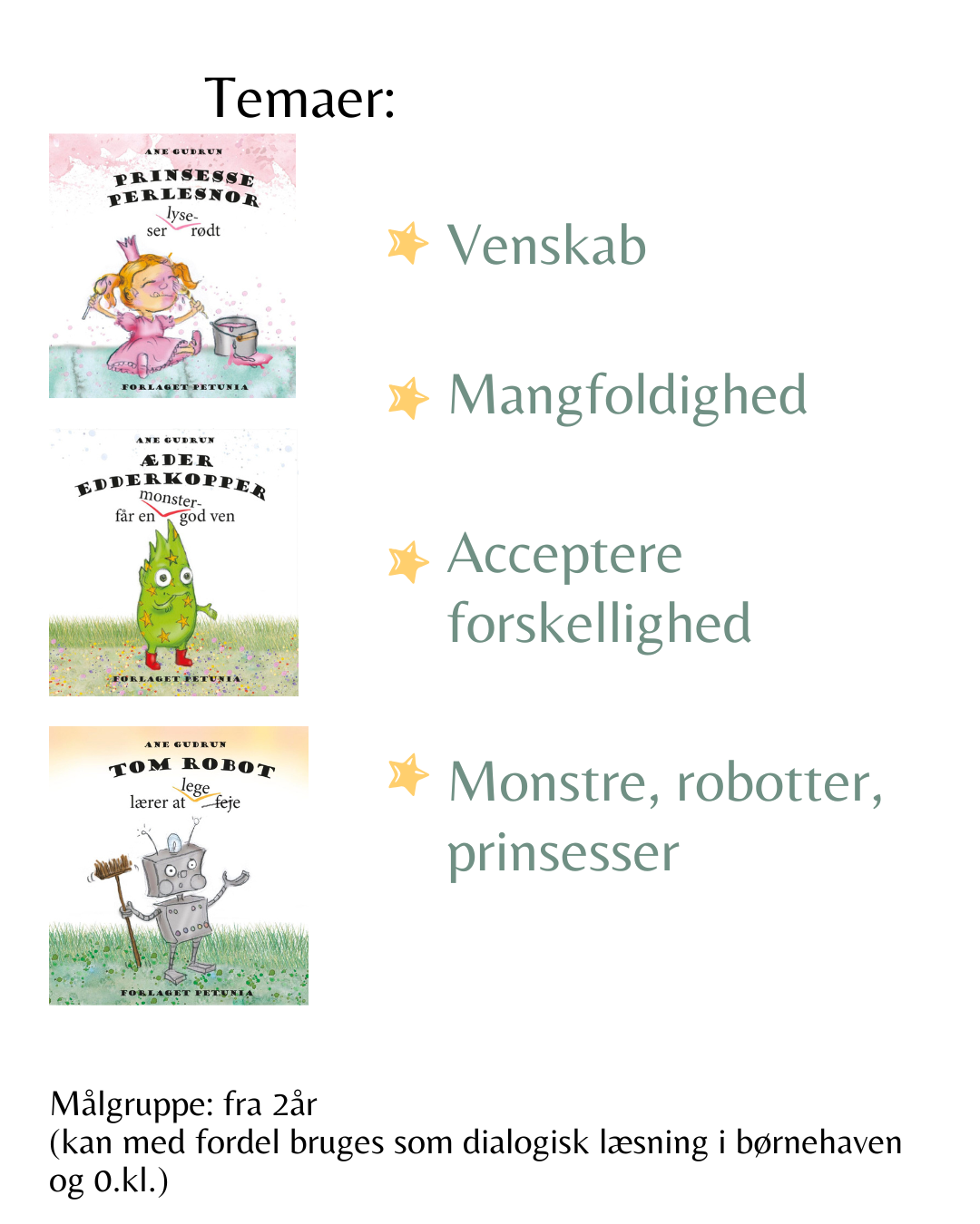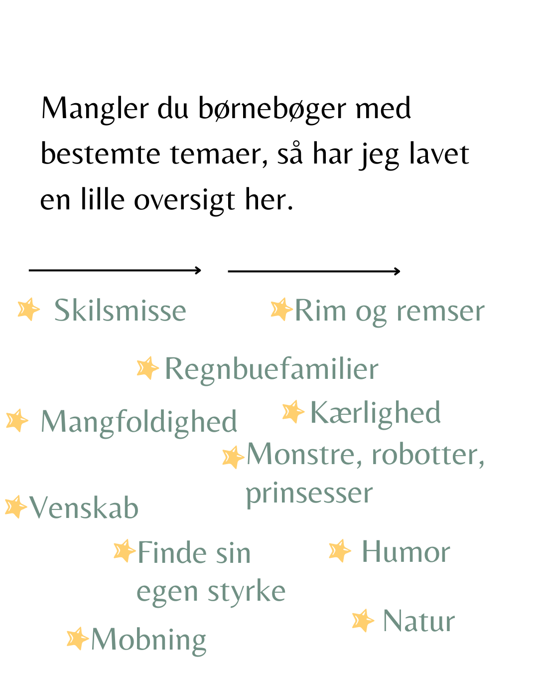 Mangler du børnebøger med bestemte temaer, så har jeg lavet en lille oversigt her, som jeg har sat op i et smarte og overskuelige billeder.