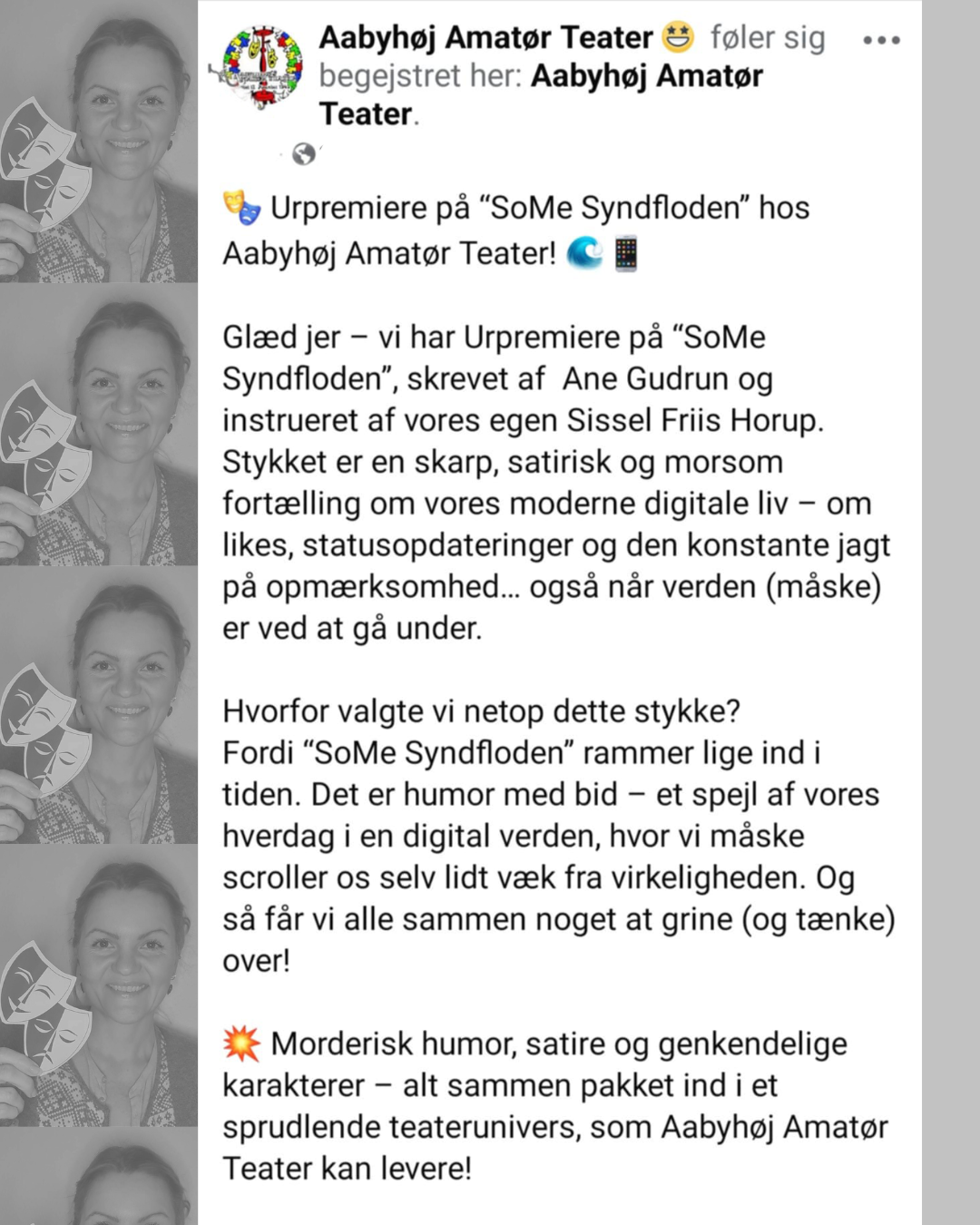 På søndag skal jeg til premiere på SoMe Syndflod på Aabyhøj Amatørteater. Et teaterstykke jeg har skrevet og senere fik udgivet hos Dansk Teaterforlag. Jeg glæder mig så meget, for det er første gang, det skal sættes op. Teateret skriver sådan om valget af stykket:
