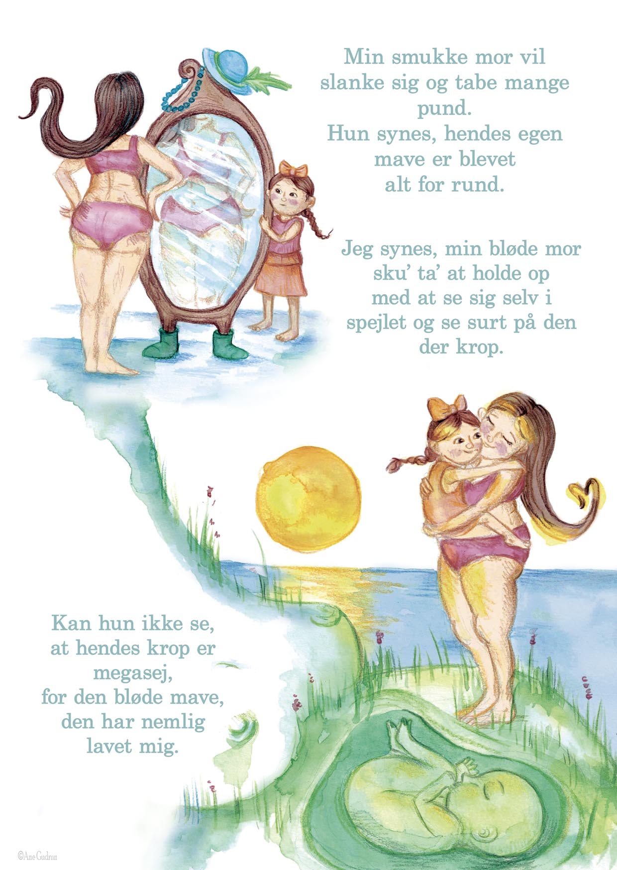 Rimet Min mors mave handler om en lille pige, som ikke forstår, at moren kan brokke sig over sin runde krop, for den krop har jo lavet hende.