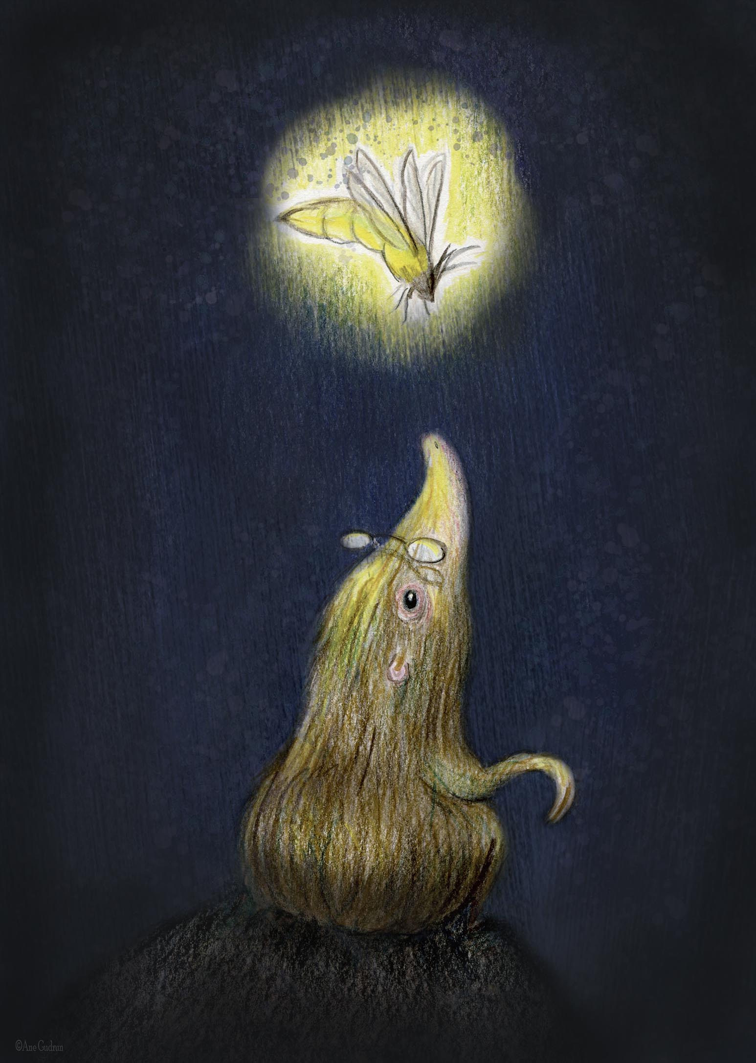 Den lille muldvarp dukker op ad jorden, misser med øjnene og ser en lille, lysende ven i nattemørket